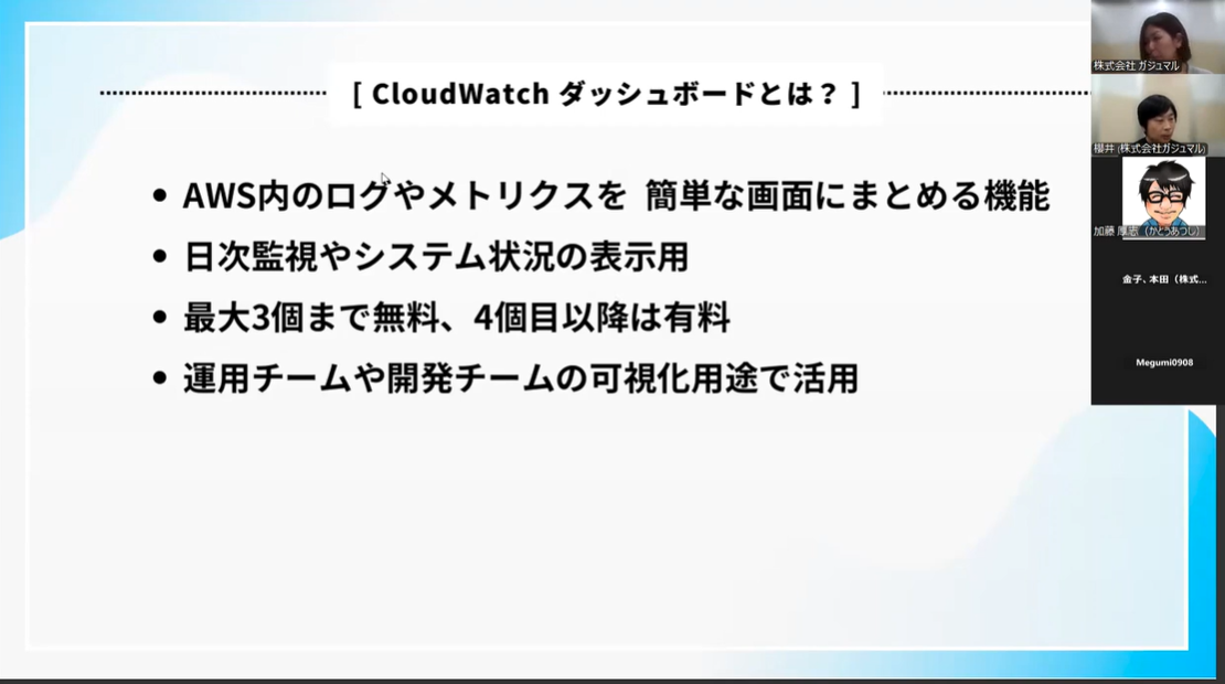 2025年7月16日(水)に「インフラ(クラウド・AWS)運用・監視:CloudWatchダッシュボード入門」勉強会をオンラインにて開催しました。