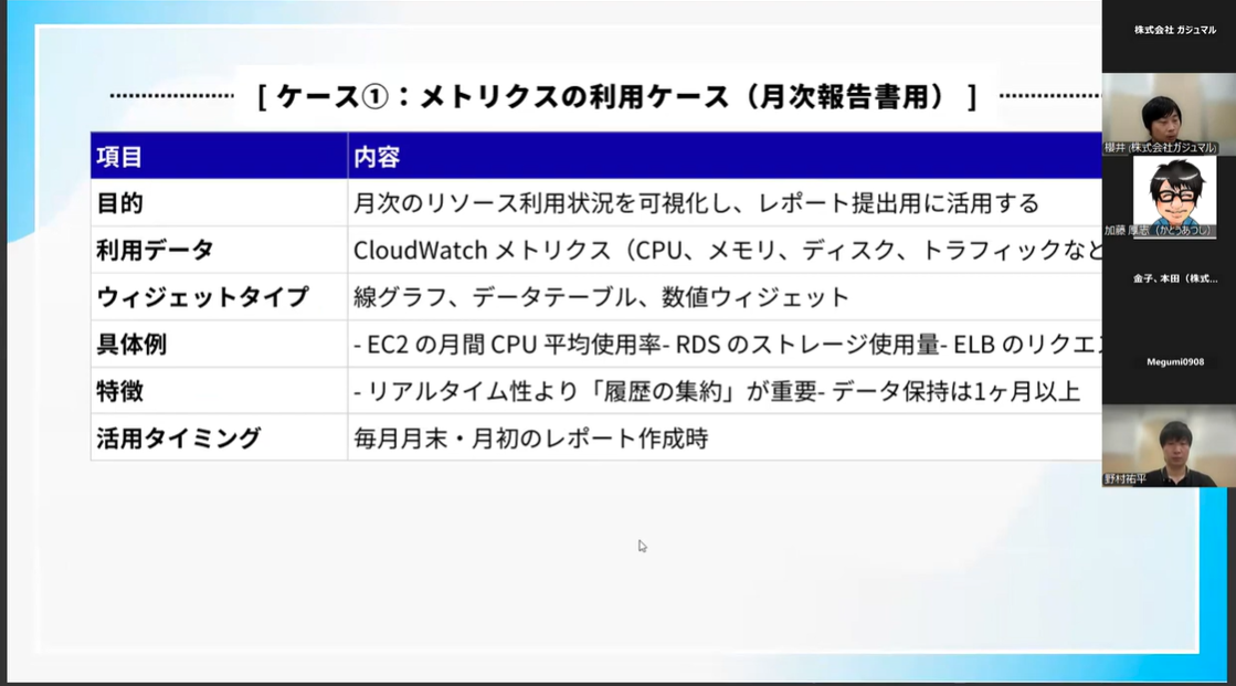 ・メトリクス活用:リアルタイム監視だけでなく、月次報告資料作成にも利用。